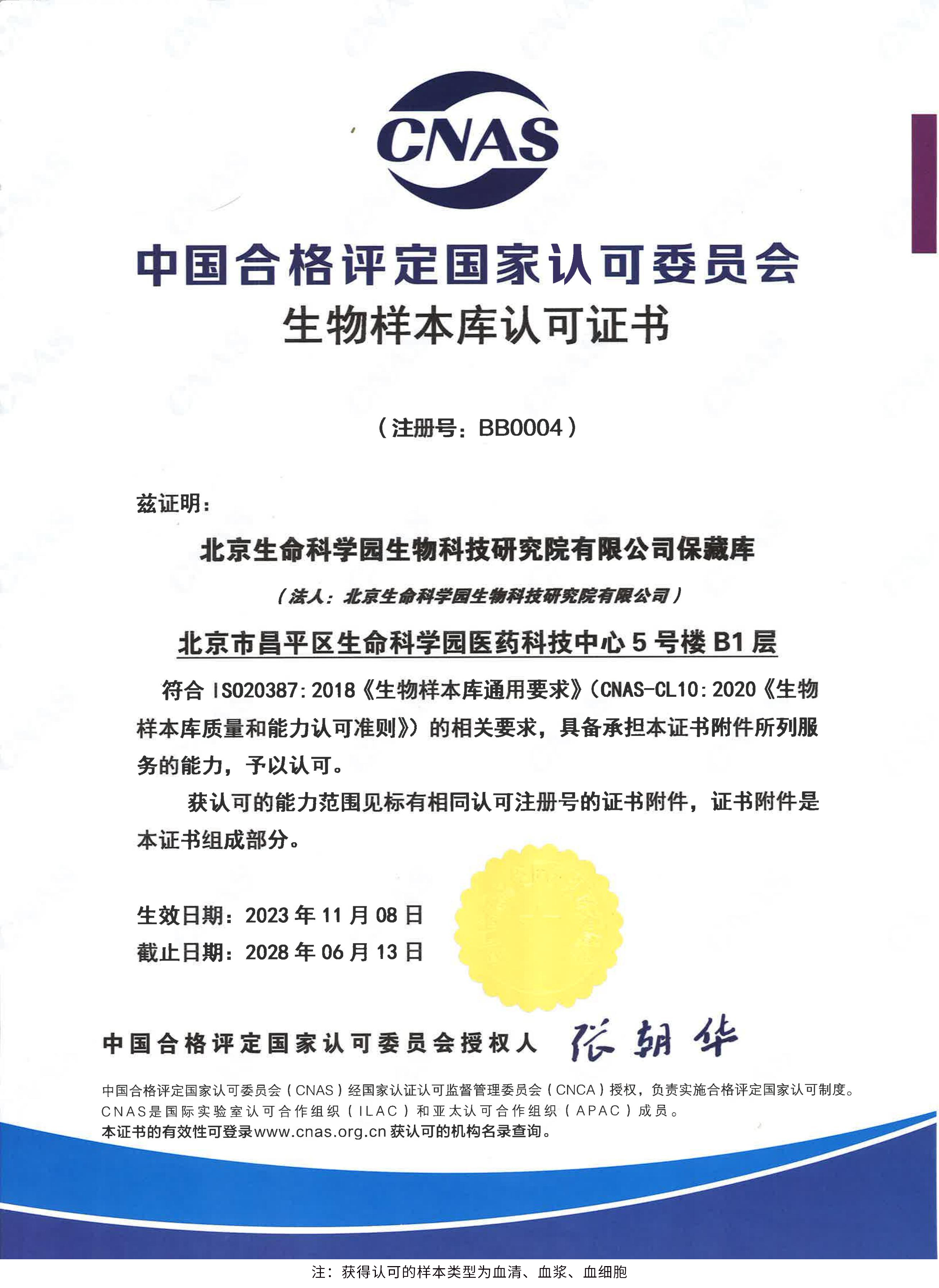 北京生命科學(xué)園生物科技研究院(以下簡(jiǎn)稱“北京生物樣本資源庫(kù)”)(Biobank of Life Science Park,簡(jiǎn)寫“BoLSP”)是一家由北京市科委和中關(guān)村生命科學(xué)園共同支持設(shè)立的第三方生物樣本庫(kù)公共服務(wù)平臺(tái),秉承北京重大疾病臨床數(shù)據(jù)和樣本資源庫(kù)(以下簡(jiǎn)稱“北京庫(kù)”)(Beijing Biobank of Clinical Resources,BBCR)十余年的發(fā)展成果,聚合眾多臨床樣本專家的專業(yè)共識(shí),致力于在生命科學(xué)、生物醫(yī)藥研究領(lǐng)域發(fā)揮銜接樣本資源持有者與研究者的橋梁作用,解決生物樣本資源開發(fā)上下游信息不對(duì)稱、資源共享困難等問(wèn)題。研究院在北京中關(guān)村生命科學(xué)園昌平園區(qū)建立了2000㎡生物樣本庫(kù),最大存儲(chǔ)規(guī)模達(dá)1000萬(wàn)份。研究院遵循CNAS-CL10:2020《生物樣本庫(kù)質(zhì)量和能力認(rèn)可準(zhǔn)則》,同時(shí)結(jié)合北京庫(kù)過(guò)去十年的工作經(jīng)驗(yàn)與教訓(xùn),建立了一套完善的生物樣本保藏質(zhì)量管理體系,從人、機(jī)、料、法、環(huán)、控多個(gè)角度,實(shí)現(xiàn)生物樣本保藏過(guò)程的全面質(zhì)量控制,先后獲得國(guó)家科技部頒發(fā)的人類遺傳資源保藏行政許可證書和中國(guó)合格評(píng)定國(guó)家認(rèn)可委員會(huì)(China National Accreditation Service for Conformity Assessment,CNAS)頒發(fā)的“CNAS認(rèn)可證書”。